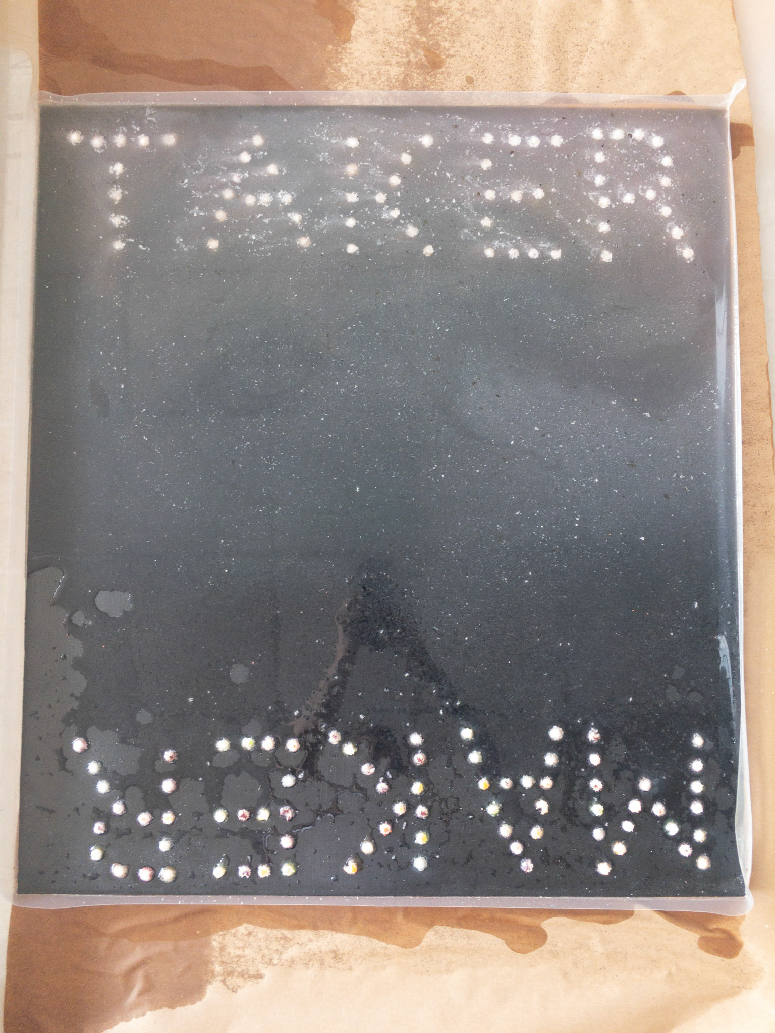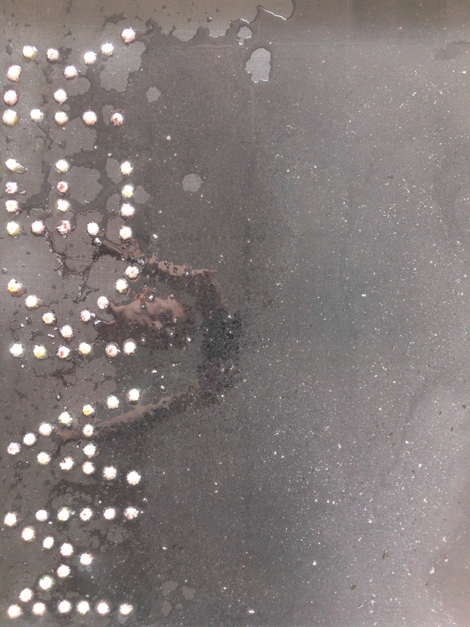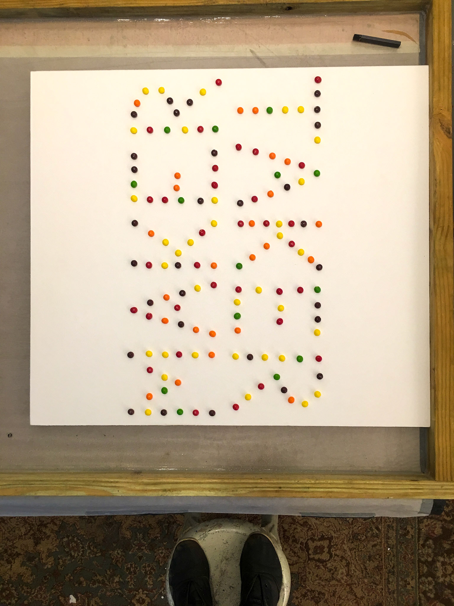 Makertaker I, 2019. Asphaltum and salt with skittles on panel.