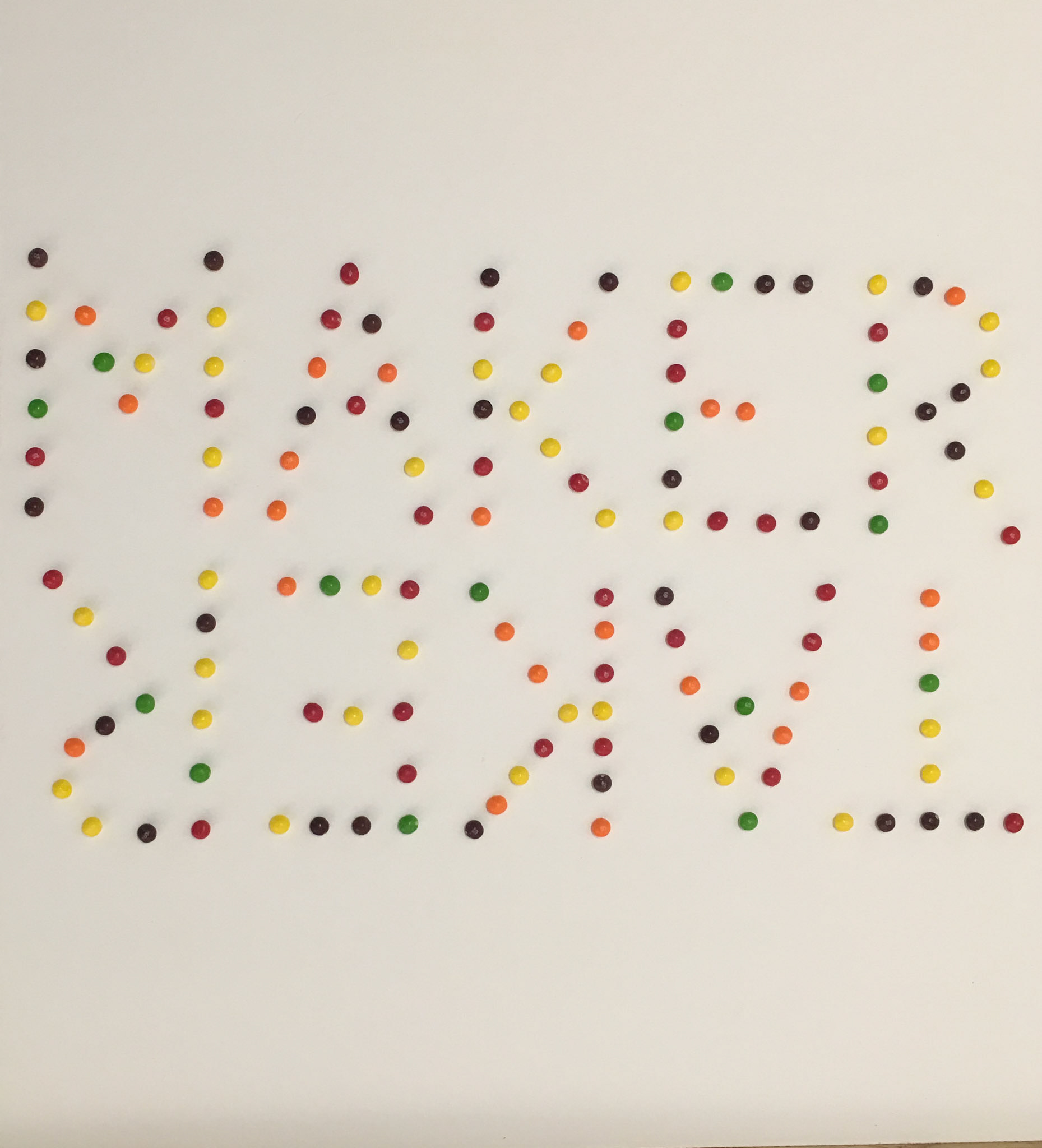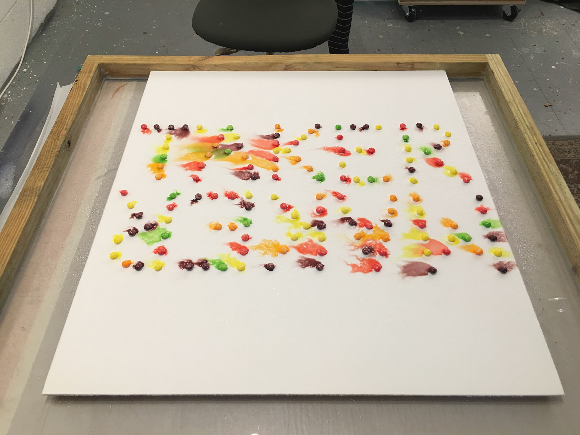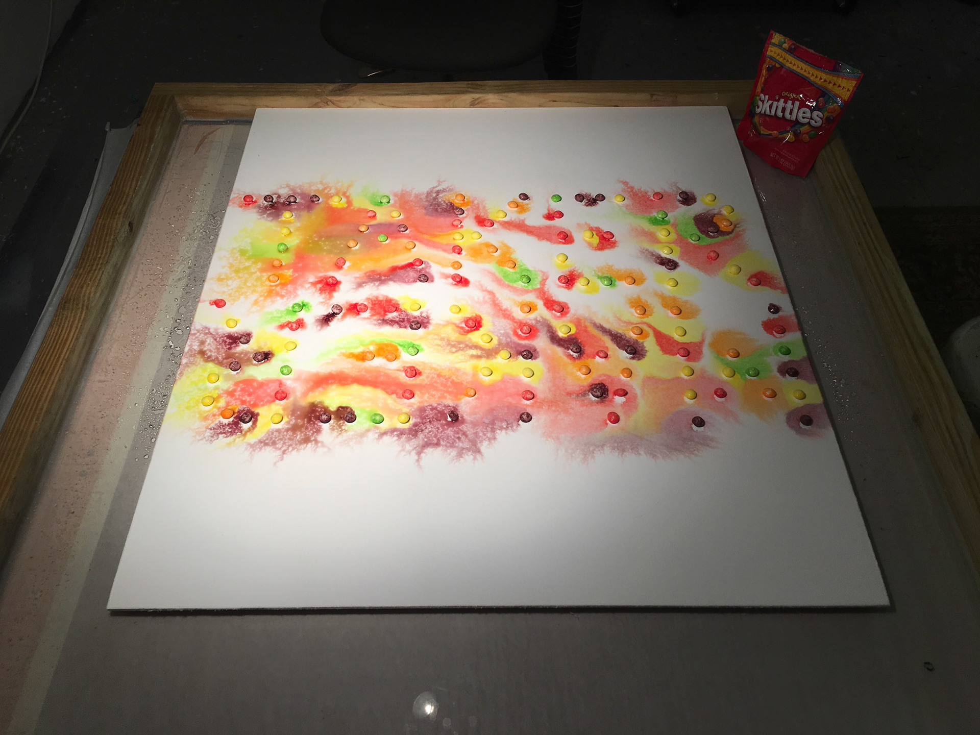 Makertaker II, 2019. Skittles-dyed paper on cotton rag paper mounted to wood panel.